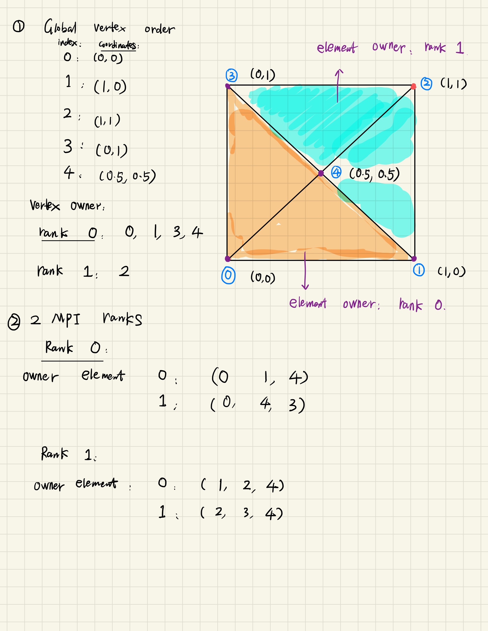 * A simple 2D square mesh with 5 vertices and 4 triangles, shared by 2 MPI ranks (see the below image for the mesh, also attached file).